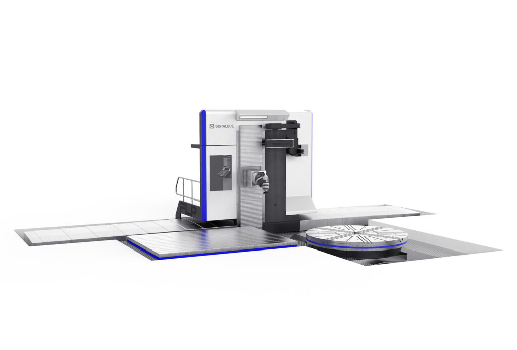 Nuova fresatrice a montante mobile multitasking SORALUCE FLP80 dotata di testa millesimale di fresatura/tornitura, tavola girevole di fresatura/tornitura ed equipaggiata di unità di governo Heidenhain mod TNC 7.